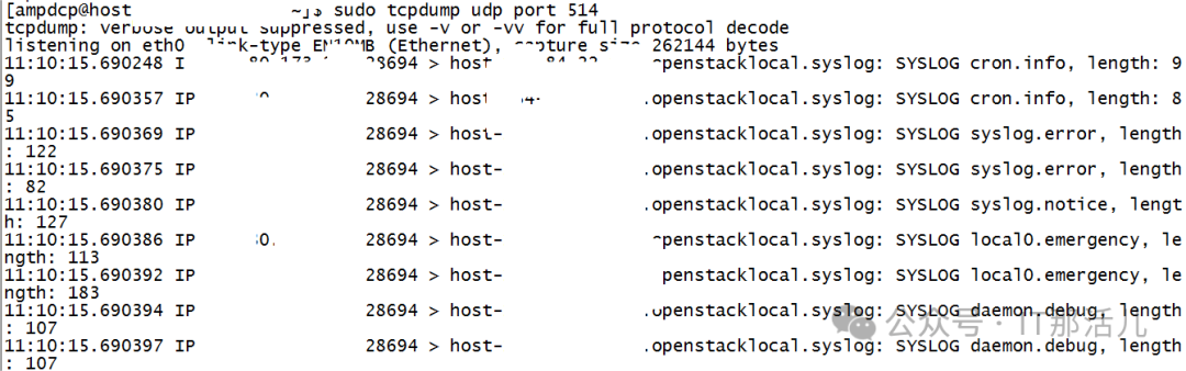 F5侧配置完成后,可以在本地抓包查看。使用tcpdump udp prot 514。