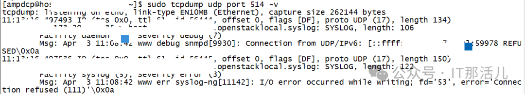 可以看到已经有日志信息推送到本地了,如果想要看详细的日志信息,可以使用命令tcpdump udp prot 514 -v或 tcpdump udp prot 514 -vv命令:
