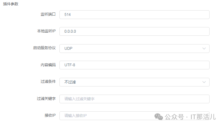 其中本监听IP填写0.0.0.0即可。结果会送配置中的topic,可以在平台点击创建,也可以在后台手动创建后在前台选择,此topic将保存日志接收插件收到的原始信息,所以在topic的数据过期时间、副本、分片数等参数,根据自己需要接入日志的设备数量酌情配置。