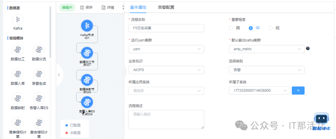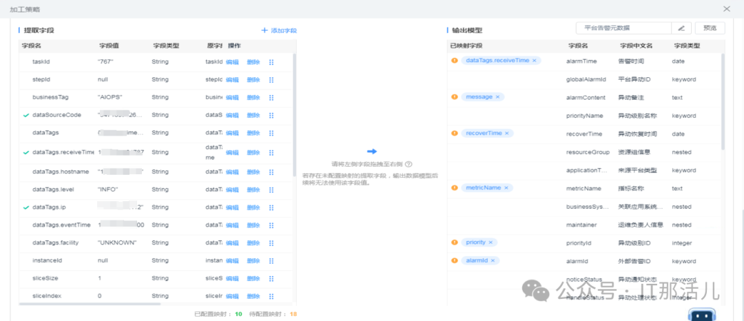 告警接入的最后一个节点如要入库es,由于es中定制好了索引的格式的,所以在前置的“数据加工节点”和“数据映射节点”中,