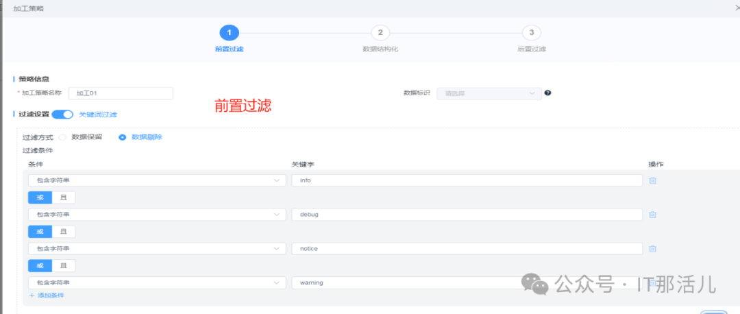 对原始数据进行前后置过滤,过滤方式可以选择数据保留和数据剔除,配置完成后,不满足前置过滤规则的数据将被剔除;对原始数据结构化,需要使原始数据满足告警入库的字段,否则数据会因为格式不匹配的原因无法入库。