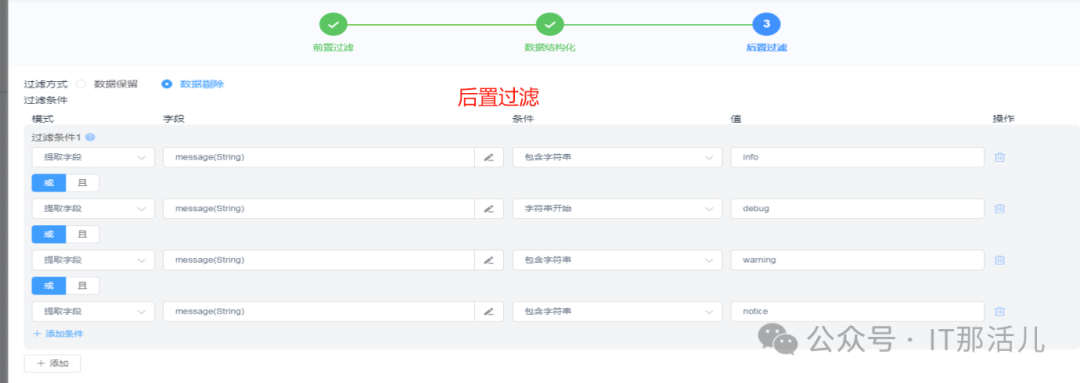 如果有告警屏蔽的要求,可以在“数据加工节点”中对告警进行去除和保留,“数据加工节点”中分为前置过滤和后置过滤。可以使用正则表达式或者字符串匹配的方式完成筛选。