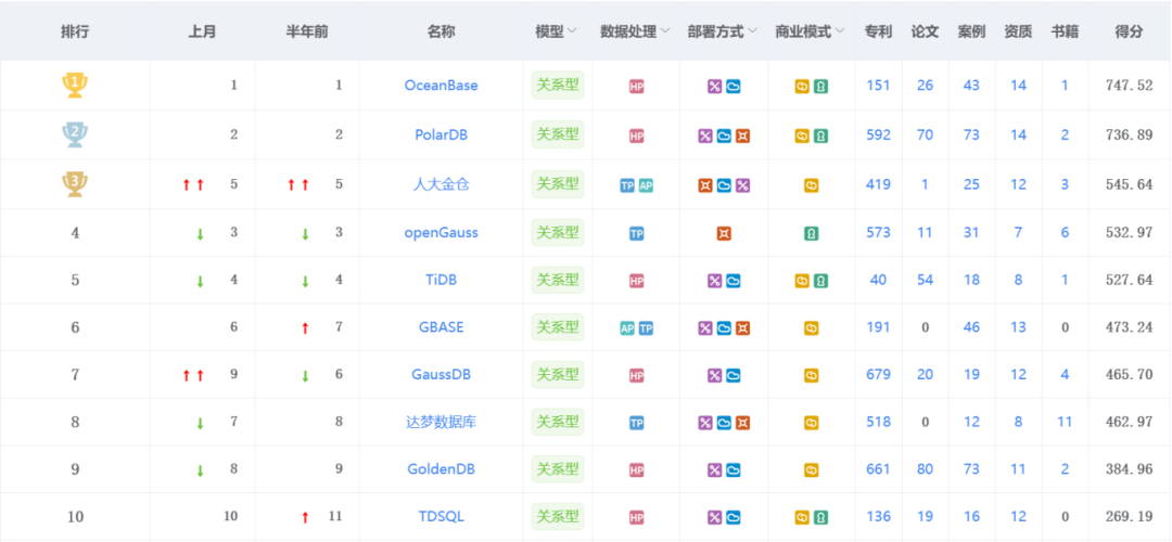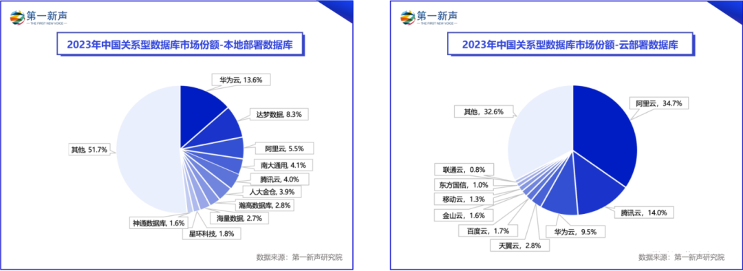 在部署规模上,2023年中国关系型数据库市场份额中,本地部署数据库市场相对集中,CR5占比达到 35.5% ,CR10占比约 48.3% ,其中华为云以约13.6%的占比位列第一;云部署数据库市场头部效应明显,CR5占比超60%,前三家市场份额超50%,其中阿里云占比34.7%,排名第一;腾讯云占比14%,排名第二;华为云占比9.5%,排名第三。(CR-Concentration Ratio,是指某行业的相关市场内前N家最大的企业所占市场份额总和)。