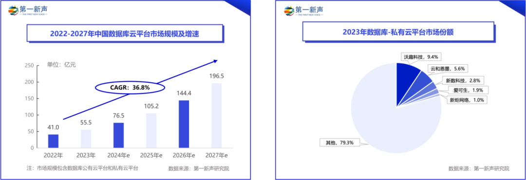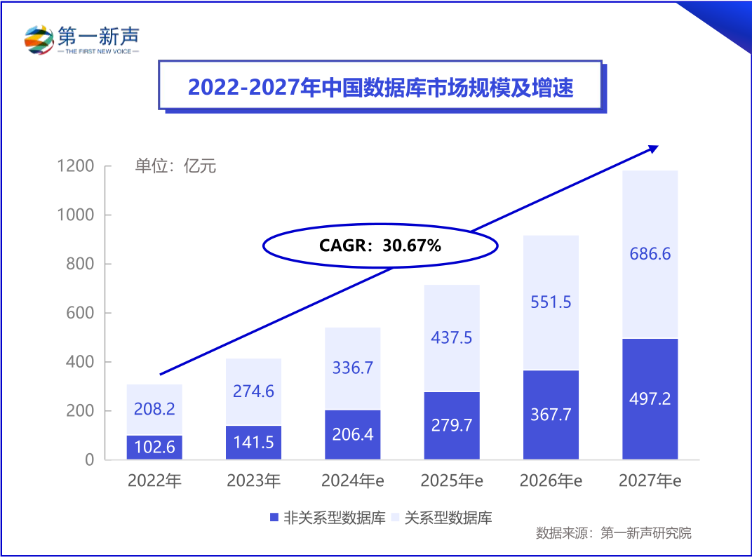 2022-2027年中国数据库整体市场将维持增长态势 ,2024年整体市场规模预计为543.1亿,到2027年将增长至1183.8亿,2022-2027年复合增长率达到30.67%。