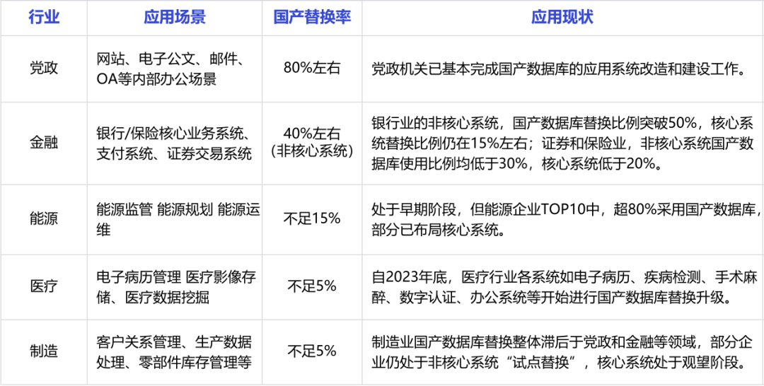 在国产数据库替代方面,党政领域的数据库国产替代率高达80%,已经基本处于替换的尾声阶段;八大行业由于对国产数据库的稳定性、迁移难度、运维难度等方面要求更高,所以整体替换率不高,金融行业非核心系统处于40%左右,能源行业不足15%,医疗、制造、教育等多个行业甚至不足5%。