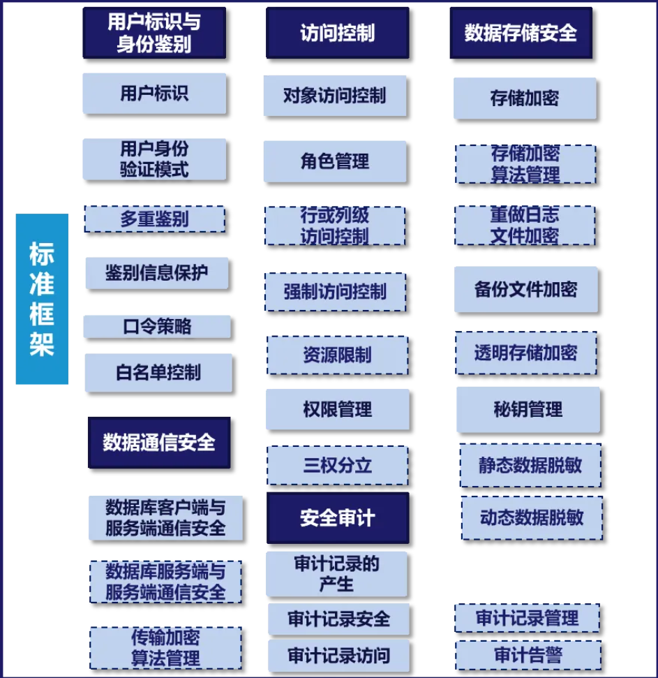 近日,在中国信通院“可信数据库”关系型数据库安全能力专项测试中,北京自然原数科技有限公司 Kingwow(金乌) 数据库V5.0产品、金篆信科有限责任公司 GoldenDB 数据库、中兴通讯股份有限公司 EBASE-T 安全数据库顺利完成测试。测试过程依据《关系型数据库安全能力技术要求》标准,在用户标识与身份鉴别能力、访问控制能力、数据存储安全能力、数据通信安全能力以及安全审计能力五大能力域的相关要求。测试结果表明,该产品在关系型数据库安全能力方面均符合标准要求。关系型数据库安全能力标准框架如下: