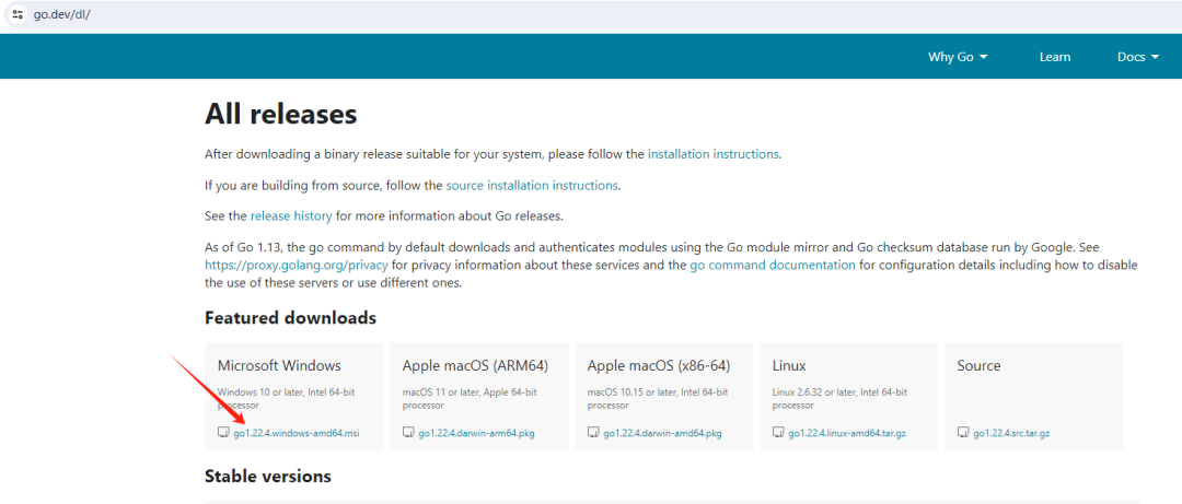 点击上面箭头所指的链接下载Go安装包,再双击下载之后的安装包就可以安装。