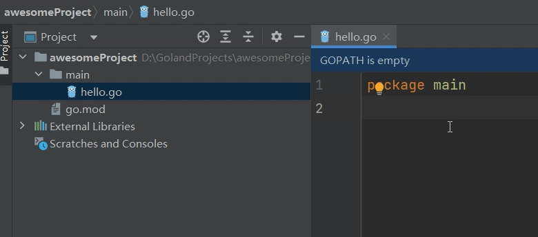 进到项目里面之后,先新建一个文件夹main,再新建一个文件hello.go,效果如下: