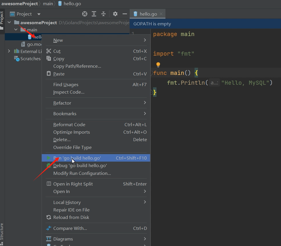 package mainimport "fmt"func main() {fmt.Println("Hello, MySQL!")}