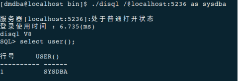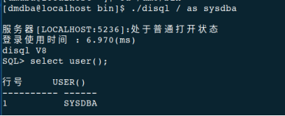 [dmdba@localhost bin]$ ./disql as sysdbaSQL> select user();