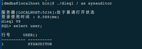 [dmdba@localhost bin]$ ./disql as sysauditorSQL> select user;