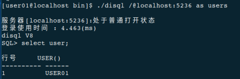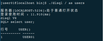 [user01@localhost bin]$ ./disql as usersSQL> select user;