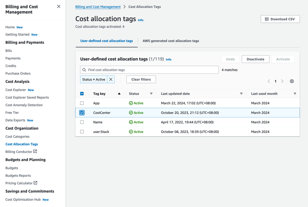 激活标签后,标签的状态立即更改为“活动”。需要注意的是,通过发票和成本管理/成本浏览器控制台可视化标签的财务数据几乎需要一天的时间。