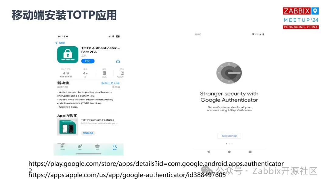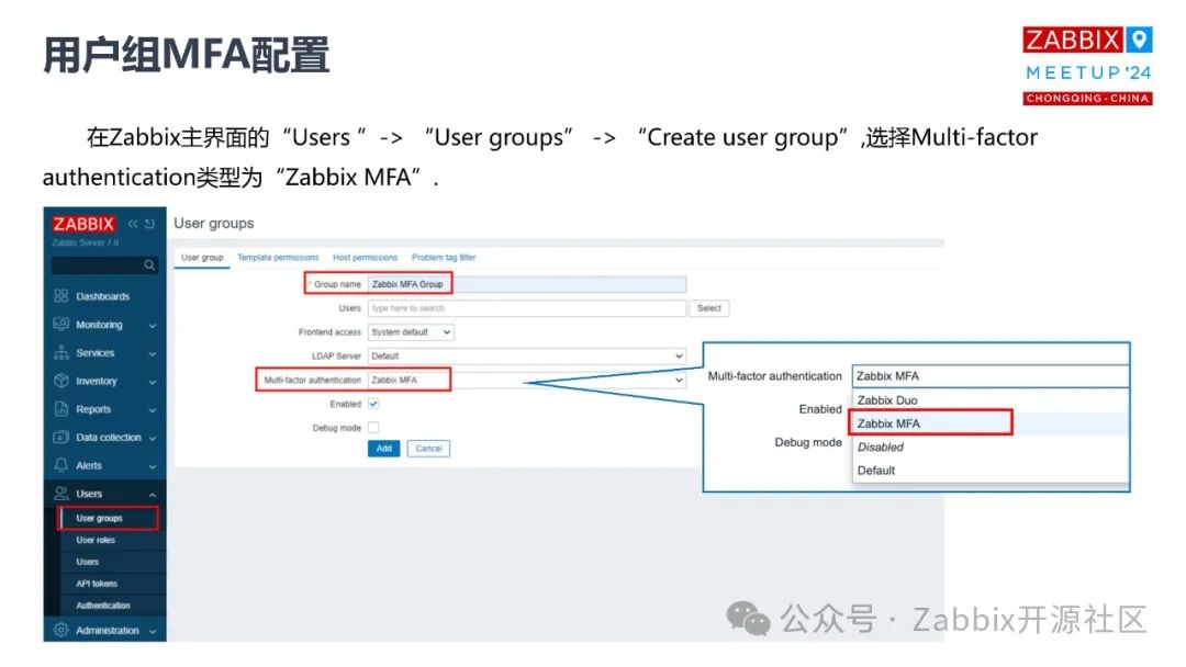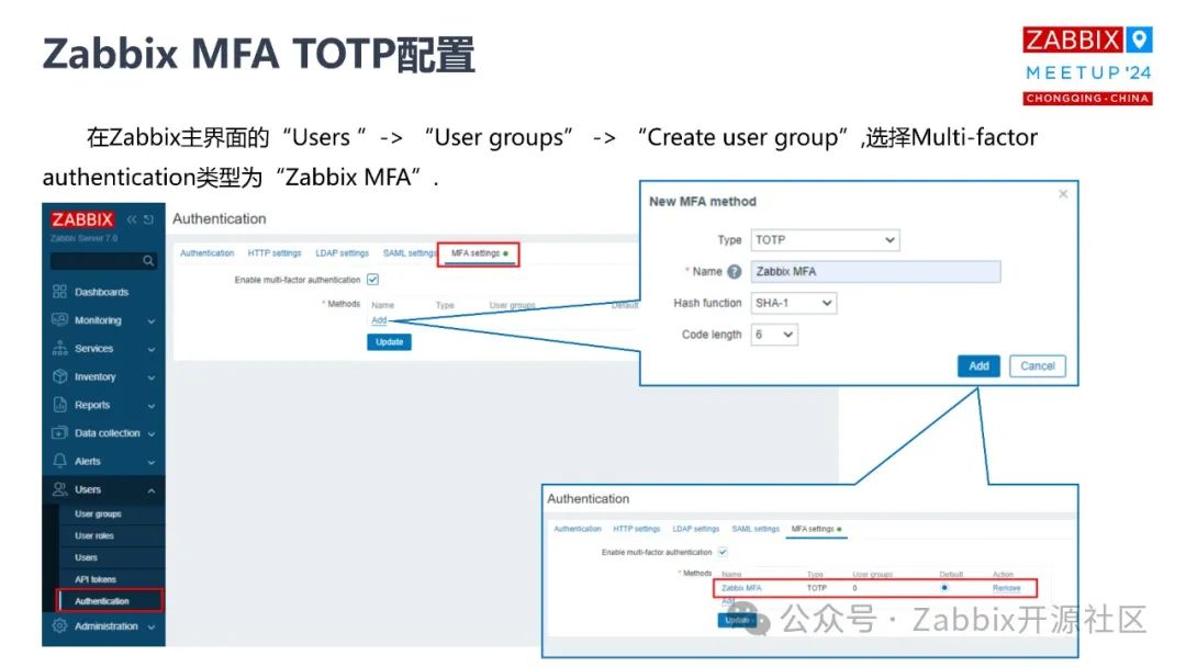 基于这两种方式我都举了一些例子。这些例子都是基于对应的认证方式的手机APP来做的,这些手机的 APP 都可以下载去尝试。不管你用哪种方式,说到底就是为了让你更安全地登录Zabbix 系统。无论你是用第一个客户端,还是用微软的认证客户端,两种方式都可以,我在这里面都有一些效果,包括登录的效果,包括配置的效果。你也可以用 Google。这两种方式,APP 都可以先下载,如果你真的要做这个操作,有了这些 APP 后就直接上图了,可以看到这就是整个配置过程。Zabbix 7.0 在这一块做了一些变动,特别是导航栏,你可以看得到它不再是以前的monitoring,和 service inventory,现在 configuration 拆分了,针对于认证的一些配置都在 user 认证的选项栏里面,有一个 MFA setting。这其实是我们去尝试配置多因子认证的地方,目前它只支持两种类型。第一个我选择TOTP,就是一次性密码方式做多因子的认证。然后可以取一个名字,你也可以选择你的加密方式,函数的复杂度,然后你可以设置一次性密码的长度, 6 位、8位都可以。配置完成之后,就要设定用户,就是对应设定哪些用户执行这些操作。这些操作都是结合你实际的情况来的,很多时候,你可能会把你的Zabbix 暴露给外网的用户登录使用,这个时候你可以针对于这个用户组下面的用户去做多因子的认证。但是对于内网环境的一些用户,也可以用普通的常规的密码登录。我们先创建了一个叫 MFA group的用户组,然后选择认证方式,只要属于这个用户组的用户登录的时候,除了要输入密码之外,还要通过 APP 扫描它生成的二维码,然后基于这个扫描的二维码,动态地生成一个一次性的密码。然后常规密码加动态密码两种方式同时匹配,才能正常登录。