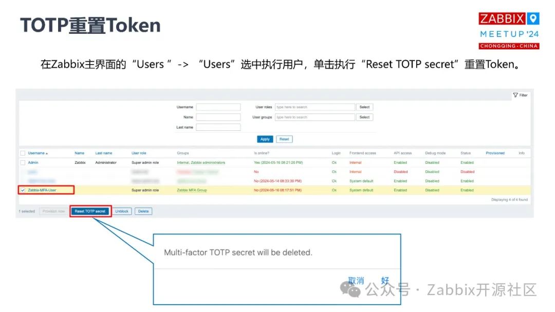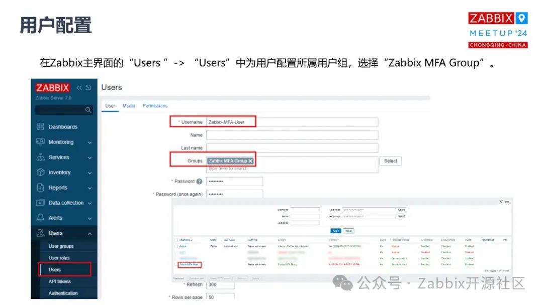 用户组设置完之后,接下来要创建一个用户,你也可以把现有的某个用户拉到这个用户组里面。我为了演示,特意创建了一个用户叫 MFA user,他的用户组是 MFA group,也就是说这个用户是跟常规的用户配置一样,包括角色、权限。这个组里面的用户都要去执行前面我们设置的这个双因子认证。这些配置完成之后,接下来我们要做的是尝试登录,这个时候输入用户名和密码,点击,然后它会出一个二维码,这个二维码其实就是要去扫描的。这个时候用第一个APP去扫描这个二维码,它会生成对应的一个动态的密码,它是有时效性的,一般都是 30 秒到 1 分钟。一旦这个一次性的密码跟你的常规的密码两者都验证通过了,就可以正常登录Zabbix界面。等到 7.0 真的发布出来的时候,很多新的事情你们自己可以去尝试一下,特别是前端 dashboard 里面增加了很多新的数据展现。