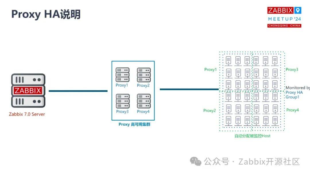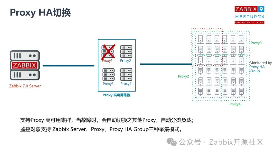 所以Zabbix proxy 的这个功能不仅限于高可用,它同时还可以做 load balance。这些 proxy 同时在做对应的不同主机的数据采集,大家平摊。假如有台 proxy 挂了,另外几台 proxy 会去计算原来的那台 proxy 上有多少监控设备,大家把工作量分一分,它会全自动去做load balance,这是代码级实现。这也是为什么 Zabbix 7.0这个功能很受用户的欢迎,因为它不需要过多的人工去介入。但是你可能会问,其他的 proxy 如果再挂掉了怎么办?这个时候其实你也可以考虑其他的一些方式,比如说用 Docker 这种方式去快速的拉取proxy 的镜像,去新添一个 proxy 加入到你的 proxy group 里面来满足,或者说保证你的 proxy 高可用还是正常在用的,完全是可以的。这样的话你就不需要再借助于其他的一些脚本定制化的方式去实现高可用,同时因为它是基于原生机制的,它整个高可用的切换实际上是非常快的。