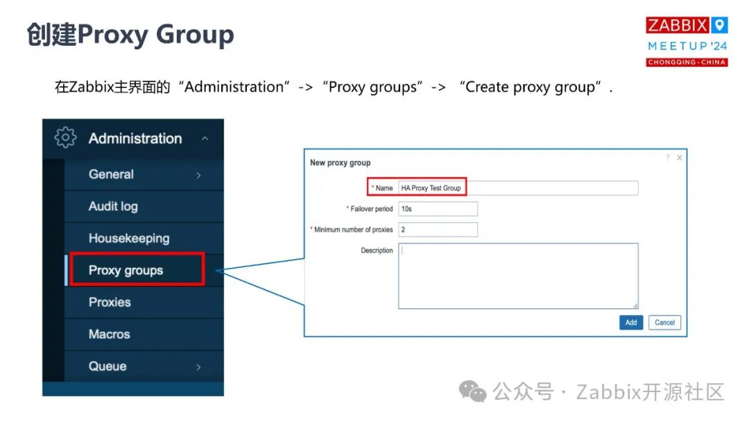 再看看前端的配置,前端配置也很简单,都是Zabbix 自身的一些配置管理。在administration,你可以创建一个 proxy group,这个名词你可以自己取好,这边有两个参数, failover 的时间,还有一个是最小的 proxy 的数量。这个 failover 的时间你可以自己设定,它有一个区间范围。最小的 proxy 的数量,正常来说你要做一个集群,至少要两个。OK, proxy group 设定好了,然后我们要创建proxy。proxy name跟 proxy 所有的后台配置文件里面 hostname 保持一致。这里面 active 还是 passive 模式都可以去做配置。这里面你可能会问一个问题,是不是一个 proxy group 里面,有三个proxy,我可以一个 proxy 用主动模式,两个 proxy 用被动模式?是可以的,因为这个跟你的高可用其实没有关系,说到底只是数据采集的问题。这些数据肯定都会采集到,只是谁来优先来发起,这个相当于去谈恋爱,谁先表白一个道理。这些操作做完了之后,你可以看到在到这一步整个 proxy 都配置完成了,就是这么简单。接下来创建主机,其他的都一样,这里面要选择主机到底是由谁来监控?你可以直接用这个 Server 来监控,也可以指定某个特定的proxy,也可以选择 proxy group。