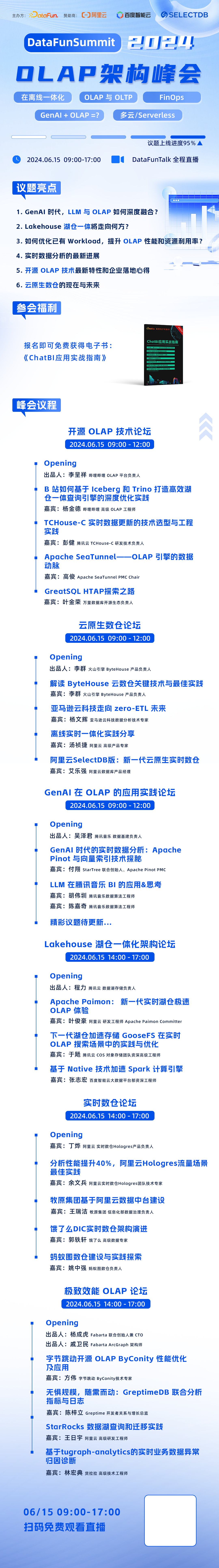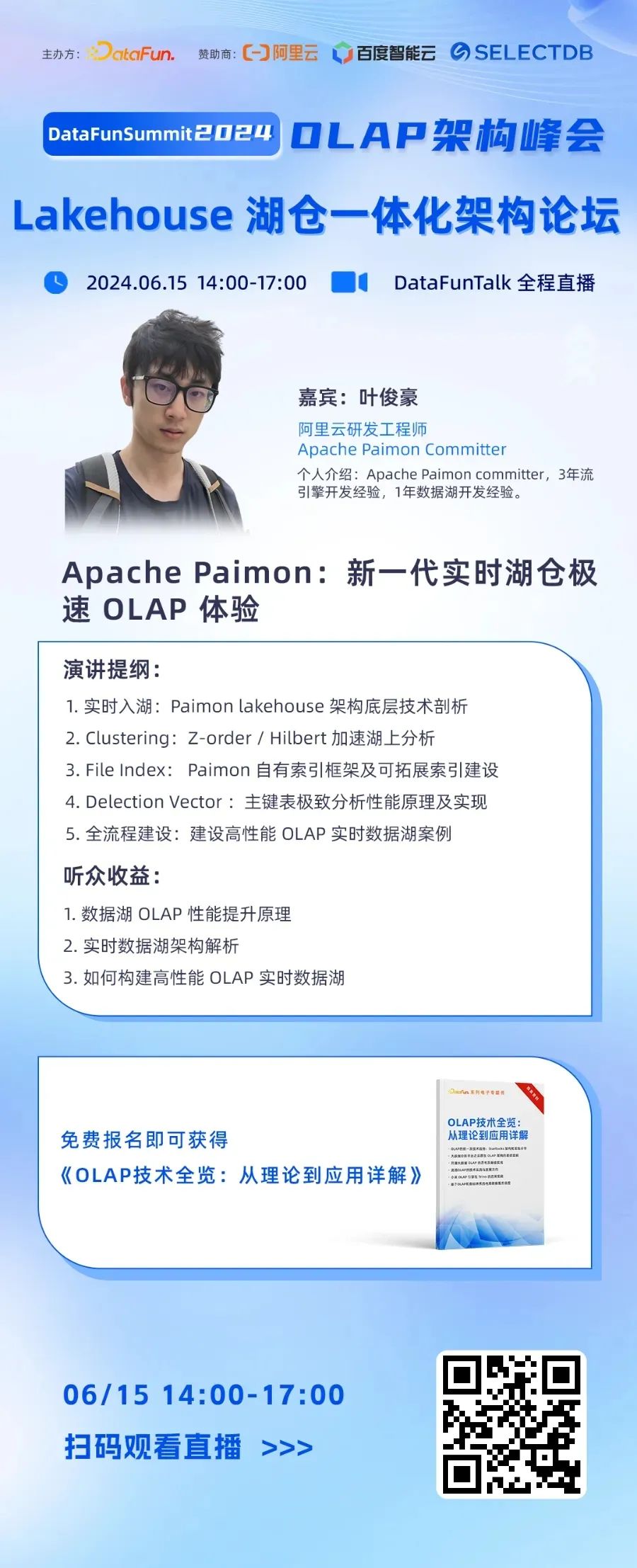 将于 6 月 15 日 举办第 58 届 DataFunSummit:邀请到阿里云研发工程师,Apache Paimon Committer叶俊豪老师,前来分享题为《Apache Paimon:新一代实时湖仓极速 OLAP 体验》的精彩内容,扫码报名,免费参会。