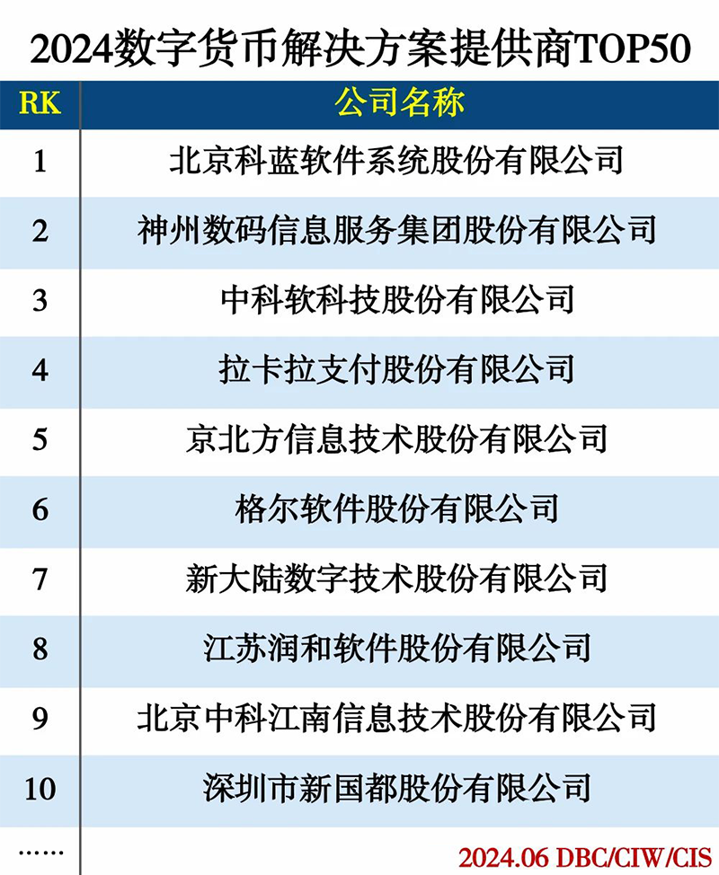 6月6日,由中国科学院《互联网周刊》、中国社会科学院信息化研究中心、eNet研究院、德本咨询联合发布的“2024数字货币解决方案提供商TOP50”排行榜发布,科蓝软件凭借数字货币整体解决方案以及在数字货币领域的持续创新荣获了“2024年数字货币解决方案提供商TOP1”的殊荣。