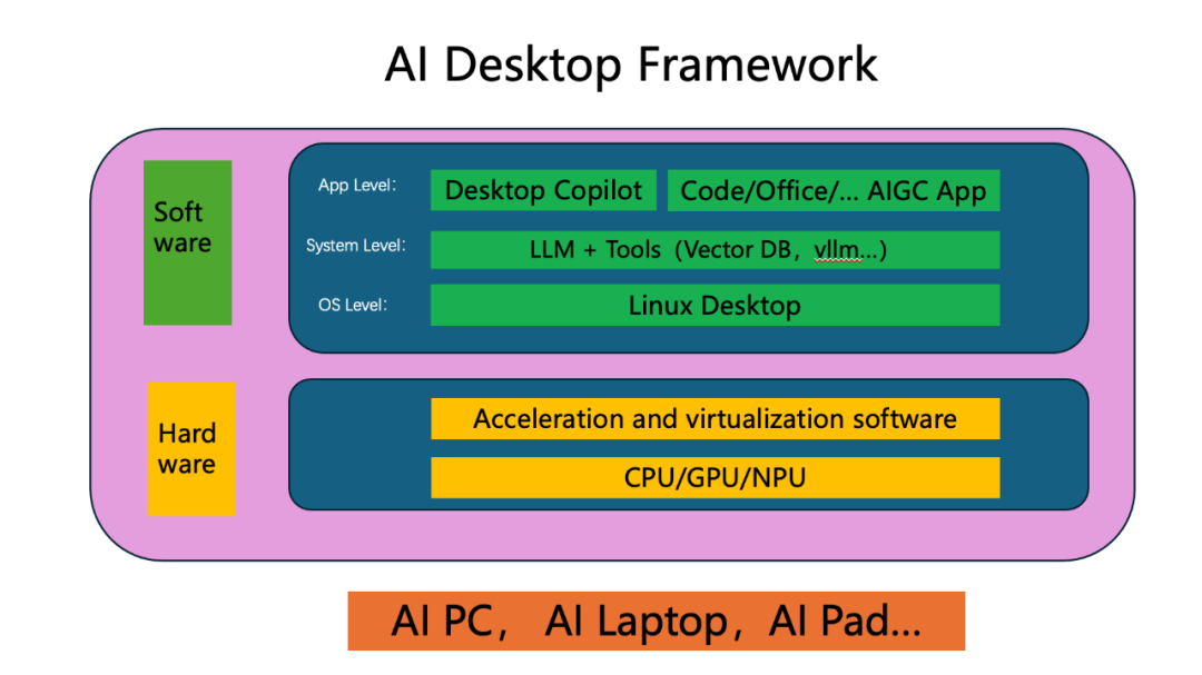 AI Desktop工作组的核心任务是在传统的Linux桌面操作系统基础上,整合大语言模型(LLM)等人工智能技术,打造新一代的桌面操作系统。这一系统将支持包括AI PC、AI笔记本、AI Pad在内的多种硬件形态,以及AI办公、AI图像处理、AI助手等多样化的软件应用。