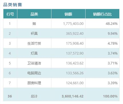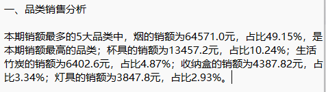 提示词2:请根据上面的数据,将本期销额最多的5大品类数据,依次罗列出来,输出格式为:品类名称,销额,占比。