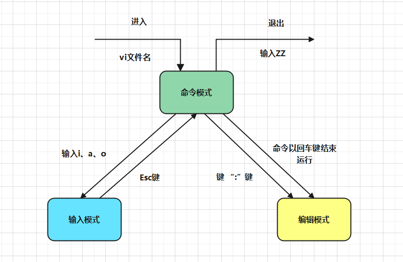 基本上 vi/vim 共分为三种模式,分别是命令模式(Command mode),输入模式(Insert mode)和编辑模式(Last line mode)。这三种模式的作用分别是: