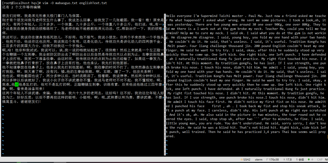 [root@localhost hqs]# vim -O mabaoguo.txt englishText.txt