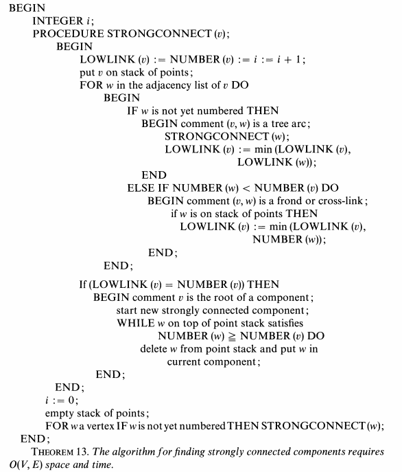 Tarjan算法是基于对图的深度优先搜索的算法,每个强连通分量为搜索树种的一颗子树。搜索时,把的当前搜索树中未处理的节点加入一个堆栈,回溯时可以判断栈顶到栈中的节点是否是一个强连通分量。