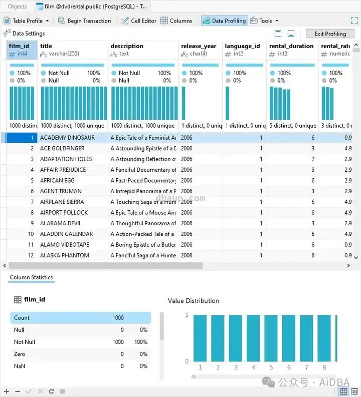 你将发现的统计信息类型包括空值与非空值的百分比,以及不同值和唯一值的数量。甚至还有值分布图!要查看所有值,你可以增加列宽,或者只需在屏幕底部的列统计中的值分布图下方使用滚动条即可:
