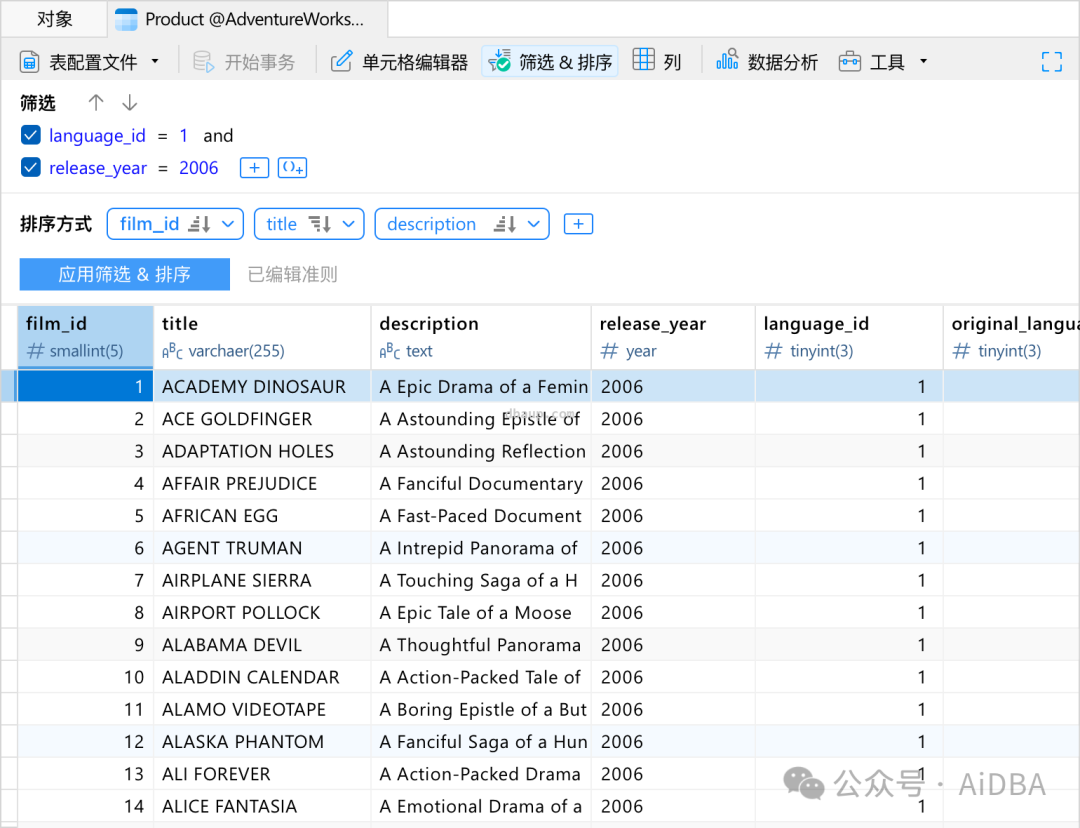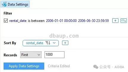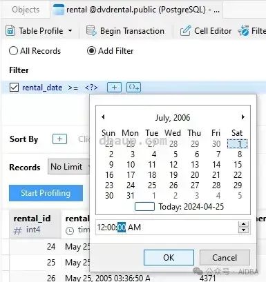 对于包含许多记录的数据集,通常需要将焦点放在数据的一个子集上,这就是“添加筛选”选项的用武之地。它允许我们使用熟悉的“过滤和排序”功能添加筛选(和排序)。假设我们只想分析 rental 表中租赁日期在 2006 年上半年的记录。我们只需在 rental_date 列上添加一个筛选,选择值为 2006 年 1 月 1 日 00:00:00 至 2006 年 6 月 30 日 23:59:59 之间的行。选择日期和时间非常容易,这要归功于内置的日期和时间选择器!