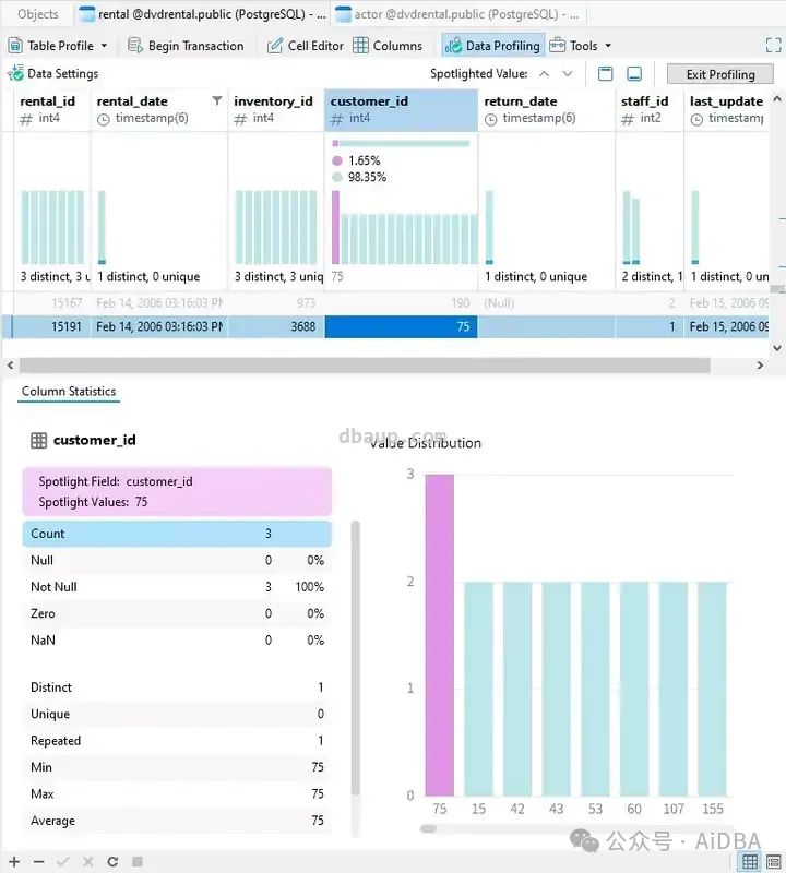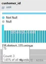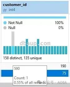 分布图中的每个条形都代表基础表、视图或查询中的一个实际记录。通过将光标悬停在其上,我们可以了解更多信息。弹出框会显示该值和它在数据集中出现的次数,以及它占所有记录的百分比: