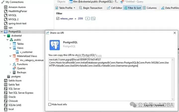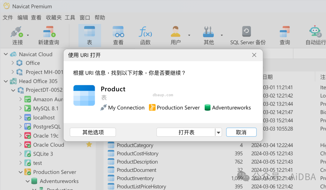 共享服务器对象URI可促进团队成员之间的协作。无论团队成员位于何处,Navicat 提供了一个快捷方式,可以轻松访问对象。单击 URI 可在 Navicat 中快速打开对象。这消除了手动导航来定位对象的需要,让每个人都可以专注于他们的任务,而不会出现不必要的复杂性。