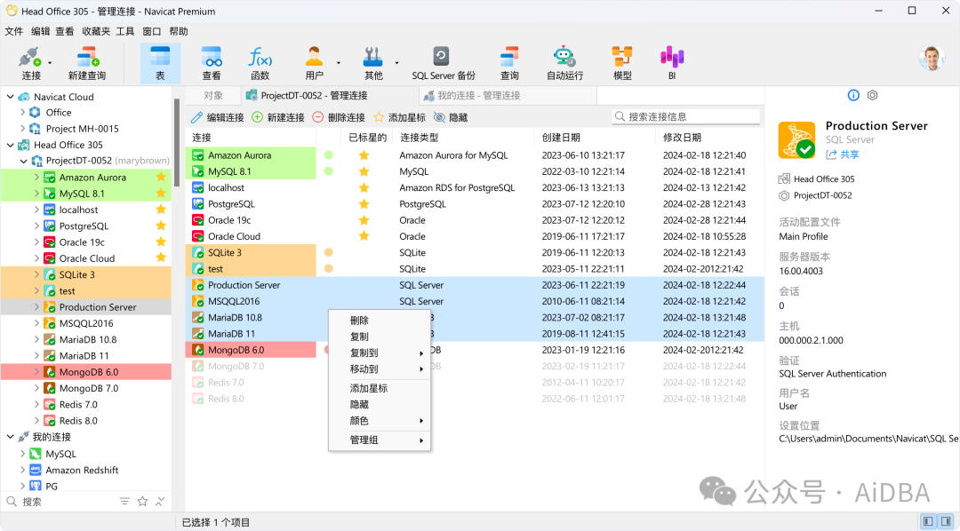 Navicat 17 通过星标、颜色、组以及隐藏功能来帮助你组织管理你的连接。