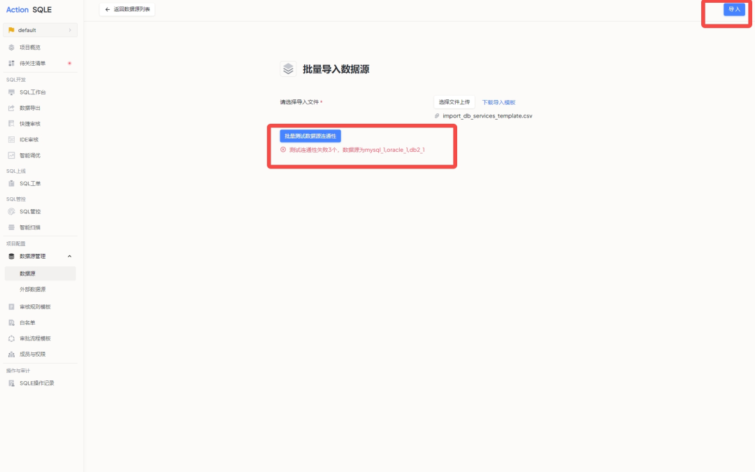 为提高平台初始化效率,现新增批量导入数据源功能。用户可通过上传 CSV 文件,快速批量导入多个数据源,减少手动添加工作量。此功能支持数据源的预检和连通性测试,确保数据源的有效性和可用性。