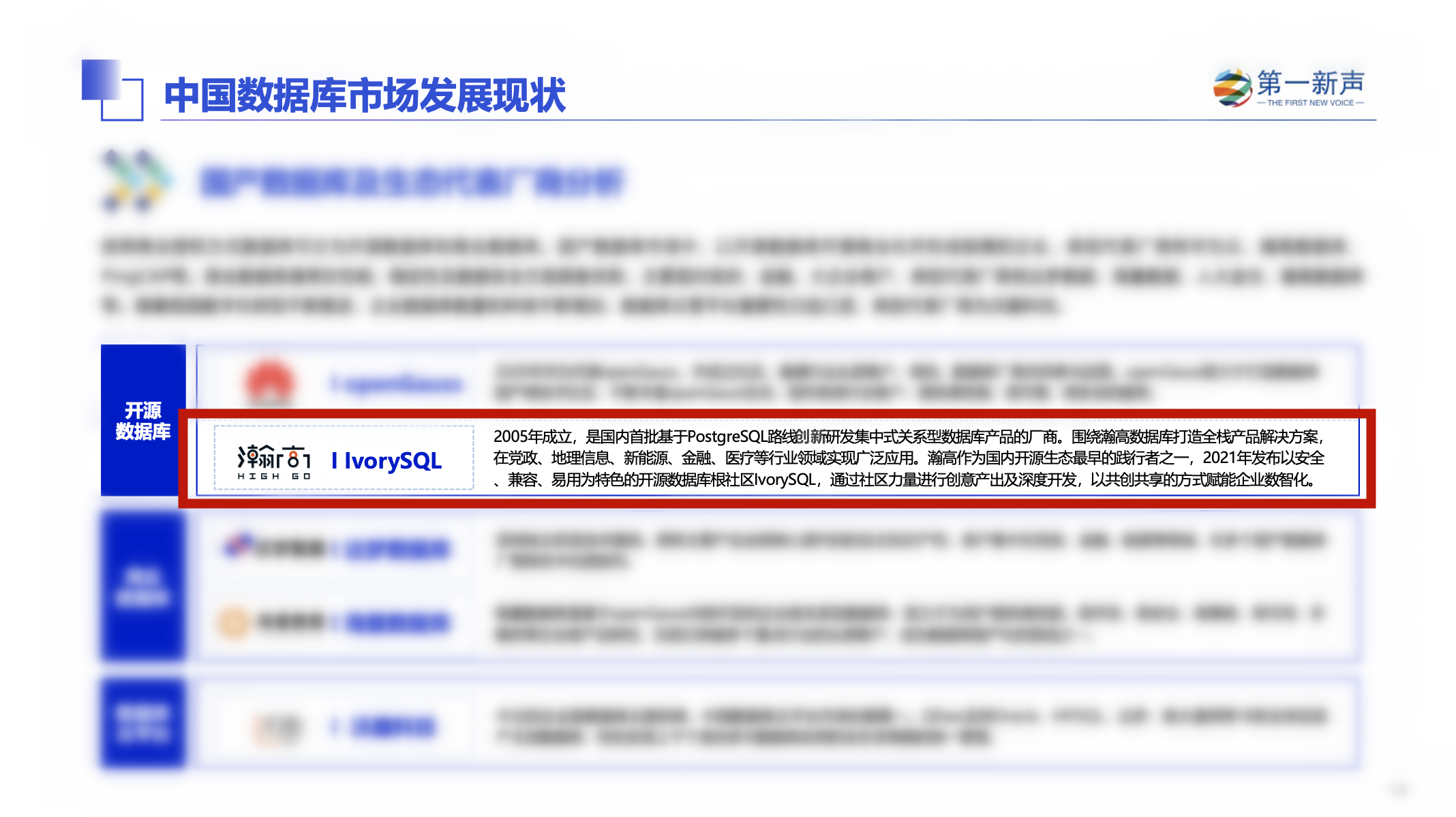 向上扎根,向下生长。作为国内首批数据库厂商之一,瀚高拥有着大量的数据库技术积累,创新研发了基于PostgreSQL路线研发集中式关系型数据库产品,开创了中国数据库开源商业发行版模式先河,具有独特优势。多年来,瀚高延续着“源于开源,超越开源”的精神追求,秉持“用开源链接世界”的企业使命,深度参与开源社区生态建设,积极拥抱开发者。值得关注的是,由瀚高主导发起的开源数据库根社区IvorySQL,作为开源数据库代表产品之一入选报告,IvorySQL以安全兼容、开放易用为特色,旨在通过社区力量进行创意产出及深度开发,以共创共享的方式赋能企业数智化,凝聚开源创新力量,共同推动开源生态蓬勃发展。