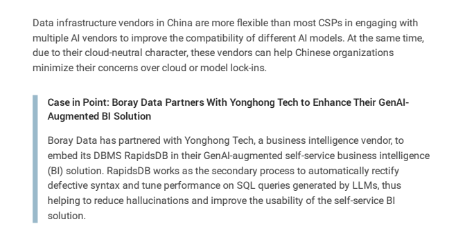报告认为,解决这些问题的方法取决于企业如何为其 GenAI 应用程序构建 AI 就绪数据。检索增强生成 (RAG) 是提高准确性和减少幻觉的有效方法。因此,使用 AI 就绪数据来维持 RAG 对企业级 GenAI 的采用至关重要。中国的数据基础设施供应商正在创新数据安全、数据质量管理、语义层和元数据管理等功能,以确保客户在 RAG 和 GenAI 应用中嵌入内部数据时具有可持续的基础。