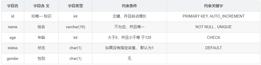 CREATE TABLE tb_user(id int AUTO_INCREMENT PRIMARY KEY COMMENT 'ID唯一标识',name varchar(10) NOT NULL UNIQUE COMMENT '姓名' ,age int check (age > 0 && age <= 120) COMMENT '年龄' ,status char(1) default '1' COMMENT '状态',gender char(1) COMMENT '性别');