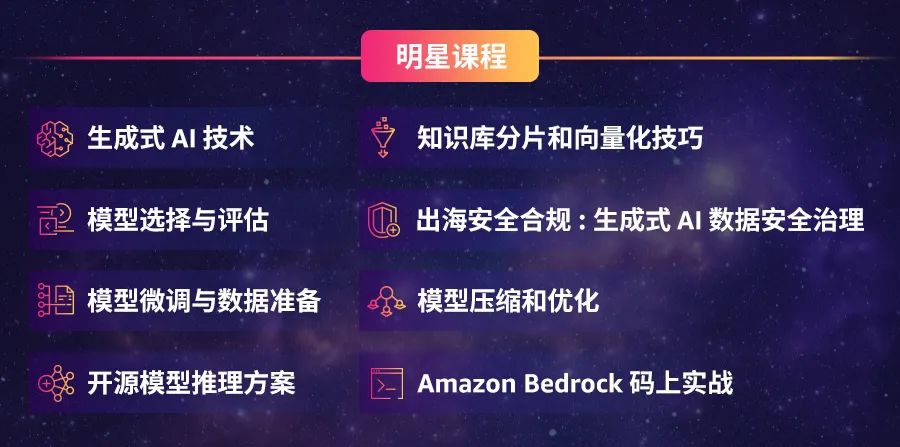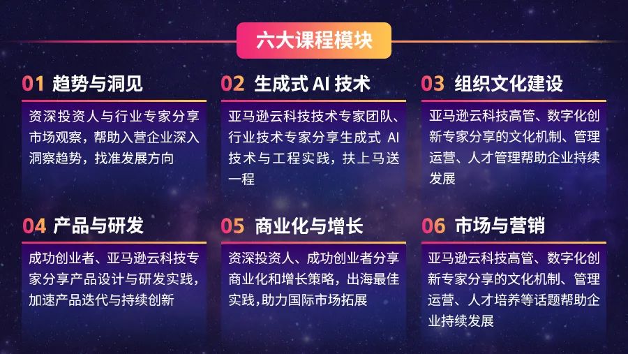 亚马逊云科技高管、资深投资人代表、知名行业专家与学者将为初创企业带来6大课程模块,30余门精品课程,从趋势与洞见、生成式 AI 技术、组织文化建设、产品与研发、商业化与增长、市场与营销角度,实现全方位赋能。