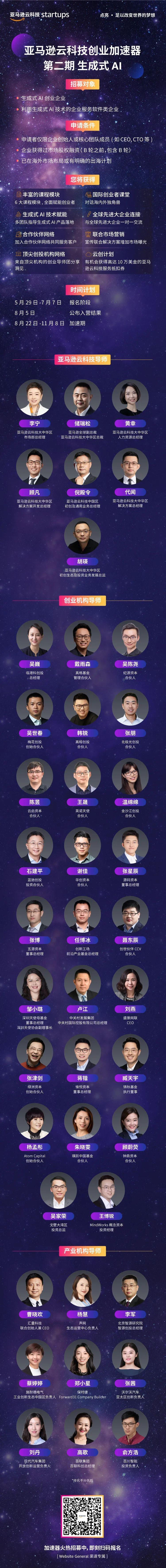 加速器联合36家创投、产业机构伙伴,将从创投网络资源对接、生成式 AI 技术赋能、全球业务拓展、创新机制构建四方面支持入营企业,找准业务场景,快速迭代产品。招募期至7月7日,入营企业还将有机会获得高达100,000美金的亚马逊云科技服务抵扣券,以及全球网络资源对接机会。