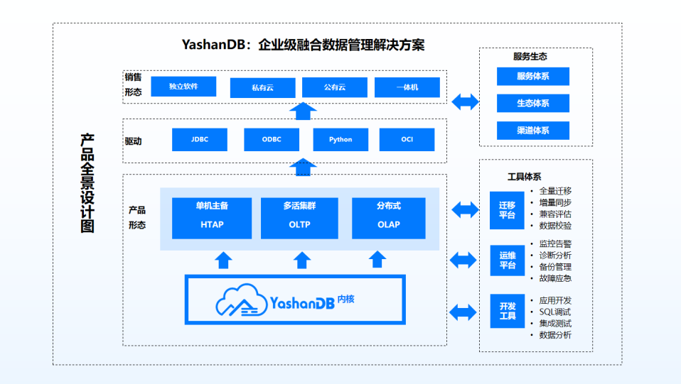 崖山数据库管理系统提供包含单机/主备、共享集群、分布式实时数仓等系列数据库产品及解决方案,覆盖OLTP/HTAP/OLAP交易和分析混合负载场景,全面兼容私有化及云基础设施,为客户提供一站式的企业级融合数据管理解决方案。