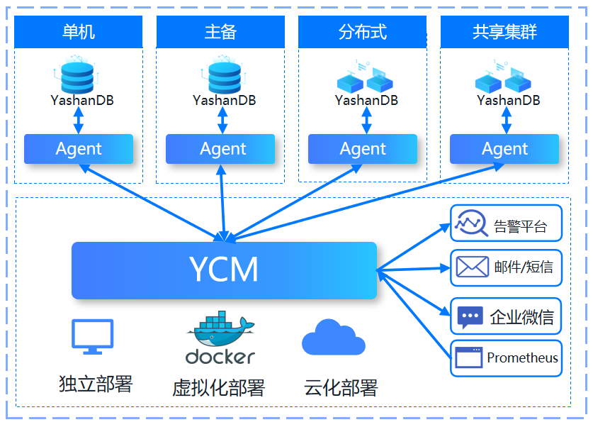 YCM支持对YashanDB单机/主备、分布式、共享集群三种形态进行管理,包括监控告警、巡检管理、表空间管理、权限管理、会话管理、备份恢复、锁管理、日志分析、慢SQL模块功能。