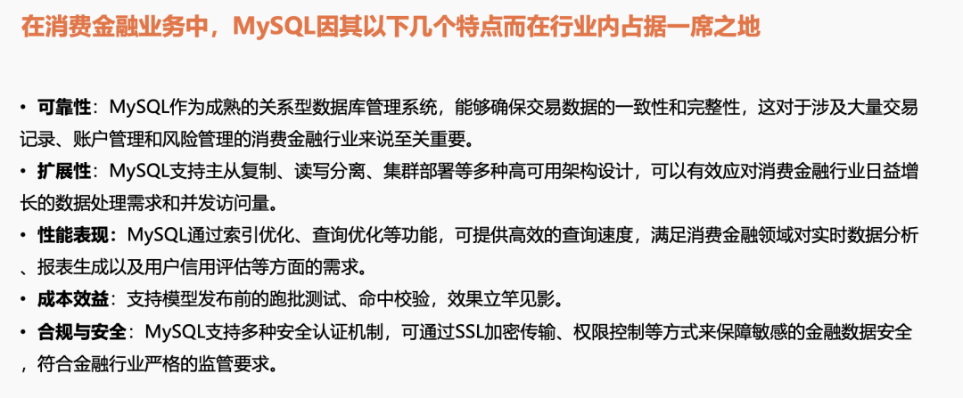 大家都知道金融机构对数据安全性的要求非常严苛,MySQL 之所以能够成为金融行业的选择对象,首先是因为它具有很高的可靠性和稳定性,这对于涉及大量交易记录、账户管理和风险管理的金融行业来说至关重要。其次是扩展性、性能表现、成本效益以及安全合规。这里重点介绍扩展性,MySQL 支持主从复制、读写分离、集群部署等多种高可用架构设计,可以有效应对金融行业日益增长的数据处理需求和并发访问量。但 MySQL 如果不做分库分表,就只能通过增加从库的方式进行只读扩展,写扩展需要做分库分表,实现难度大大增加。