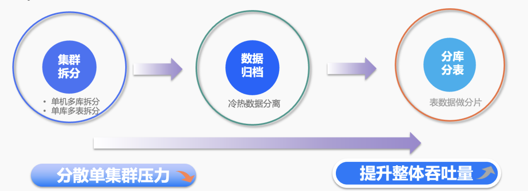 基于这三个痛点,我们在日常使用 MySQL 的时候,都会经历过三个阶段:首先是单机多库拆分,单库多表拆分,然后到冷热数据分离,最后到表数据分片。这三个处理方案其实都有各自的缺陷,基于这些问题,我们迫切地想要引入分布式数据库。当时,我们做数据库选型主要关注以下几个方面: