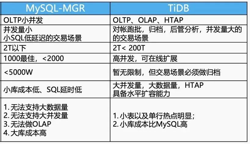 基于 TiDB 的这些特性,我们将 TiDB 与 MySQL-MGR 做了关键特性对比。对于 MySQL,我们有完整的 SOP,比如开发规范有严格的标准,数据量必须在什么范围内来使用 MySQL。超过了这个范围,就要去做拆分。此外,哪些参数必须满足,也都形成了严格的规范,比如说关联查询限制在多少个表,这些都是基于 MySQL 的局限性来考虑的。