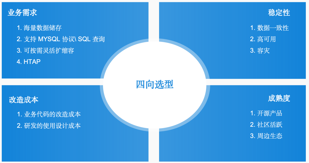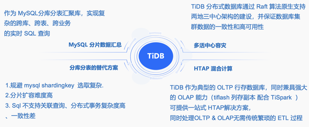我们在对比了 TiDB、OB、TDSQL-MySQL 和 PolarDB-X 等分布式数据库产品后,基于以下理由选择了 TiDB: