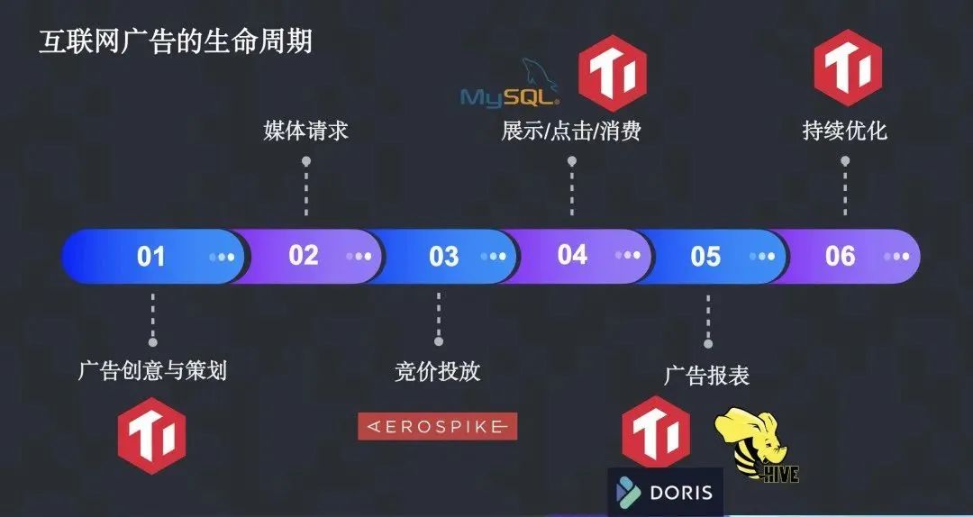 我们商业化业务线主要有广告创意与策划、媒体请求、竞价排名、广告计费、广告主报表和持续优化等关键环节。在这些环节中,TiDB 在处理大规模数据和海量高并发请求场景承担重要的角色。