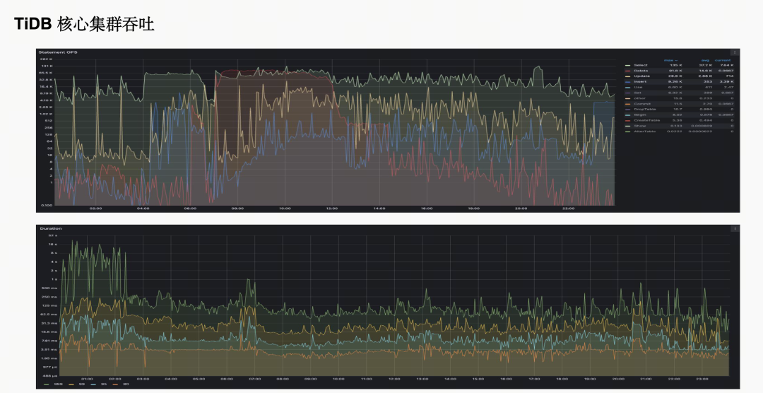 目前,我们智慧商业已将三套核心业务和 16 套非核心业务接入到了 TiDB 集群中,物理机数量超过 200 台。核心集群在业务高峰时的 TPS 达到 10 万+,QPS 达到 13 万+,数据总量超过 100 TB。