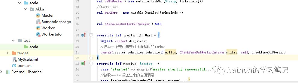 在idea中建立scala项目来实现上面的流程,这里建立了一个master类,一个worker类,remotemessage类作为消息通信的序列化,workinfo类用来封装启动的配置信息。