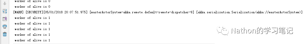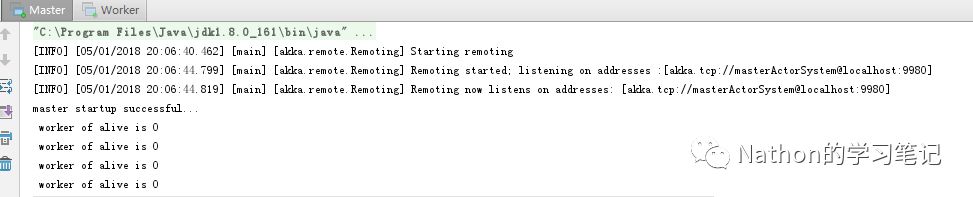 当启动master节点后,会一直监听是否有存活的worker节点,这时我再启动一个worker节点,可以看到master可以监听到有一个存活的worker节点。