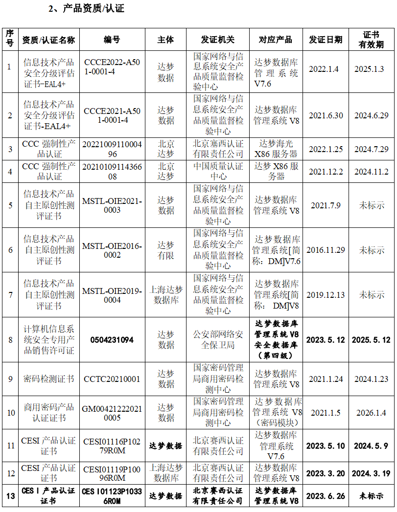 公司服务于包括建设银行、中国人保、国家电网、中国航信、中国移动、中国烟草等在内的知名用户,成功应用于金融、能源、航空、通信等数十个领域。根据赛迪顾问及IDC发布的报告显示,2019年至2022年公司产品市占率位居中国数据库管理系统市场国内数据库厂商前列。